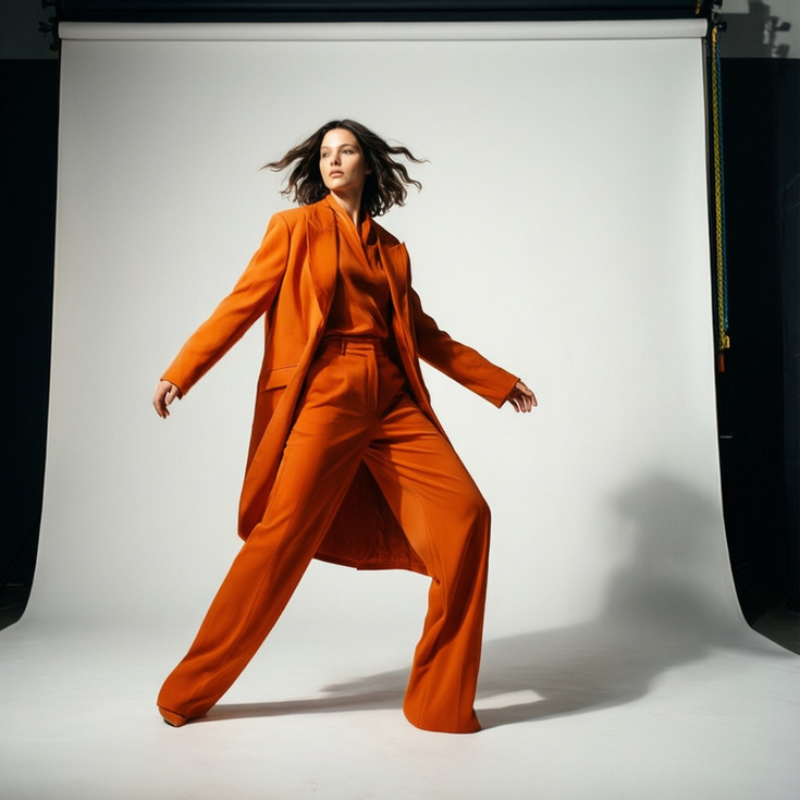 A showcase of fashion photography within the studio, demonstrating how the large cyclorama and professional lighting facilitate dynamic and high-fashion editorial looks.